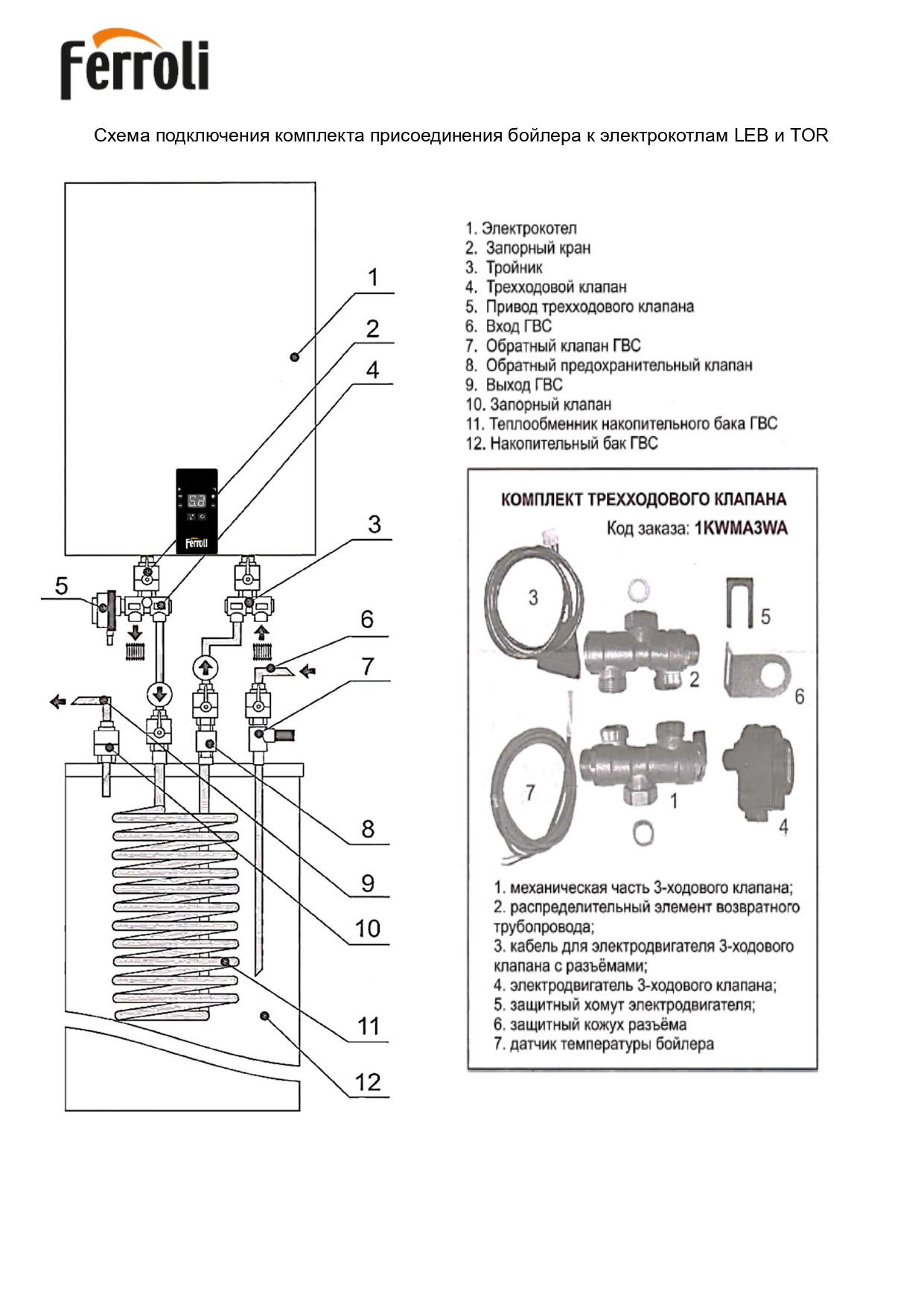 Комплект 3-ходового клапана Ferroli предназначен для подключения бойлера к электрическому котлу.